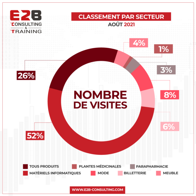 On constate que le secteur des matériels informatiques est le secteur le plus représenté dans le classement des sites web e-commerce les plus visités en Tunisie, soit un pourcentage de 52% pour le mois d’Août 2021 et une montée de 2% par rapport au mois précédent.