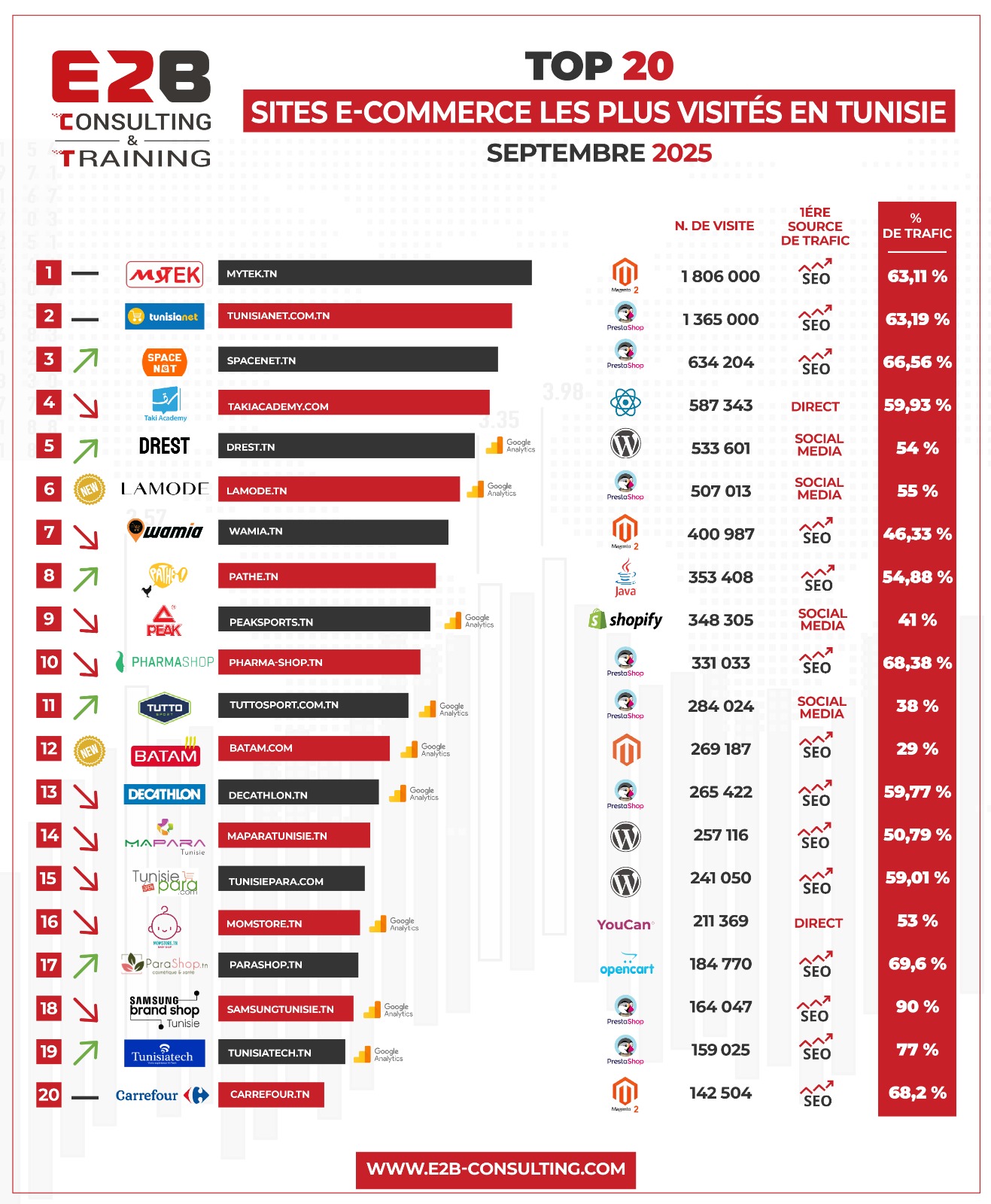 Après le classement des top des sites e-commerce les plus visités en Tunisie durant le mois de juin 2025, voici un aperçu détaillé des 20 sites e-commerce les plus populaires en Tunisie, classés selon le nombre de visites mensuelles ( Similarweb.com) pour le mois de septembre 2025. Nous analysons également les technologies utilisées (comme Magento, PrestaShop, WordPress ou Shopify) et la source principale de trafic, deux éléments essentiels pour décrypter leur succès en ligne. Ce classement, basé sur des données fiables fournies par E2B Consulting & Training, met en lumière les tendances du marché e-commerce tunisien, avec un focus sur le SEO, le trafic direct et les réseaux sociaux.